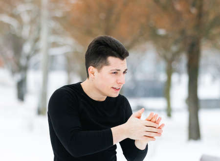 MINSK. BELARUS - January 2021: The young man warms his hands in winter while doing sports.