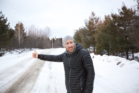 young handsome man in black jacket in winter, stood on the highway and hitchhiking.