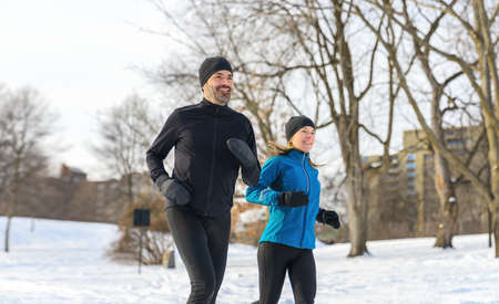 mature couple in the winter running together in nature