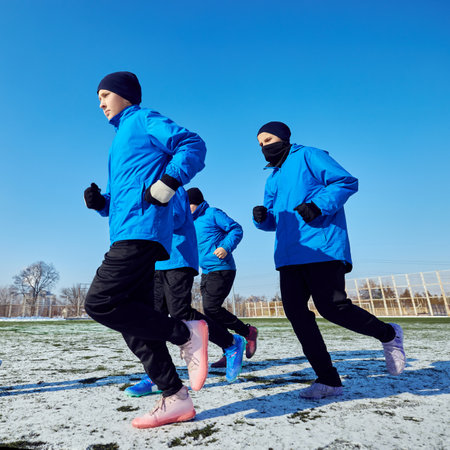 Dedicated young football players training together in winter conditions, showing determination and unity. Concept of sport, school, childhood, perseverance, teamwork, discipline, winter training.