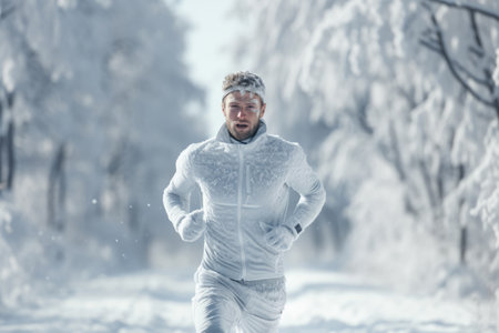 This young and fit caucasian man is actively participating in wintertime athletics while wearing headphones, showcasing his dedication to fitness.