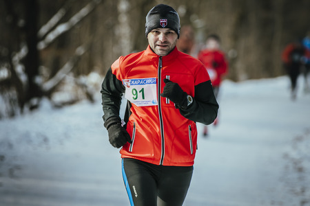 Ekaterinburg, Russia - November 14, 2015: man middle-aged runner runs through snowy Park alley in December during Urban winter marathon