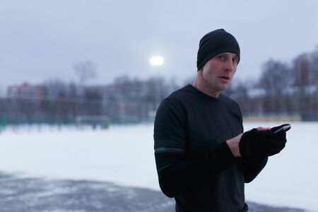 Picture of athlete with smartphone in hands at stadium in winter