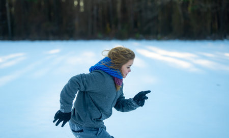 Child running outdoors in winter. Smiling child running in snow. Kid enjoying run in winter. Active winter child running. Running kid playing in snow.