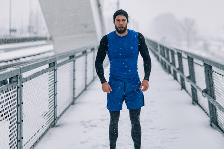 Man athlete stretching before his training on the bridge in winter cold and snow. Active and healthy life during winter. Winter exercise to stay fit.