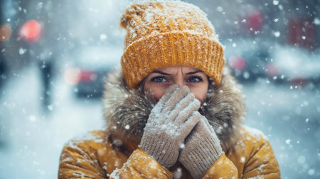 A person stands in a snowy environment, tightly gripping their gloves around their face to shield themselves from the biting cold. The landscape is blanketed in white, evoking a sense of winter chill and frost.
