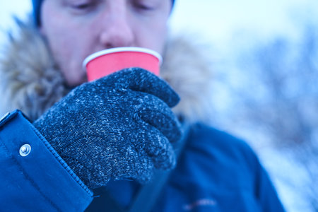 A man drinks a hot drink outside in winter from a paper cup, cold winter weather with hot tea, a mans hand in a gloves. High quality photo