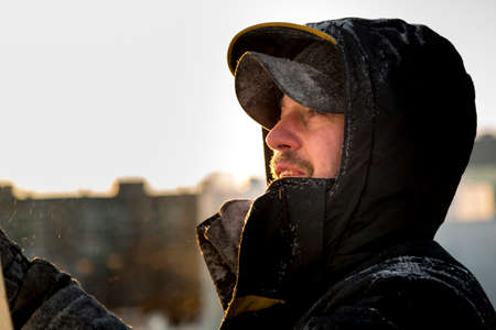 A close-up of the frost on the hood of the girl on a frosty winter day. Ice crystals on the hood and face.