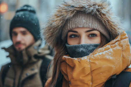 Young woman wearing winter clothes is covering her face with a scarf during snowfall
