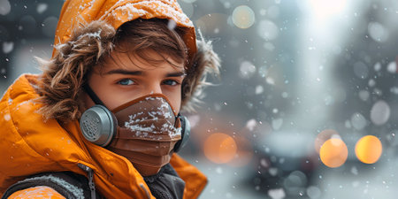 A close-up shot of a young man wearing a protective mask in a polluted cityenvironment.