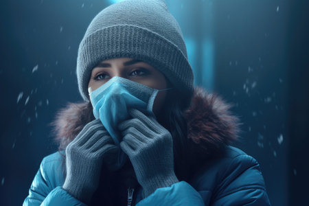 A person shielding their face from a cold wind with a blurred, icy backdrop for text placement. -
