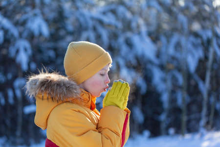 Portrait of a kid boy outdoors in warm clothes and mittens warms his hands with his breath. It's cold outside.