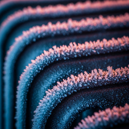 Extremely close-up of frost-covered heat exchanger tubes to highlight the significance of temperature control in industrial processes