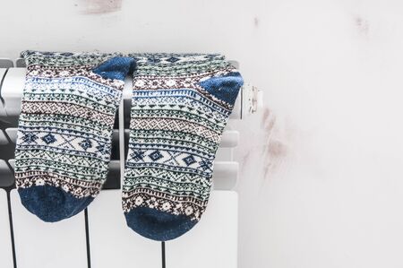 Women's feet in socks on an old cast-iron battery in an apartment in winter, a cold apartment, a heating season, a battery in an apartment, it's cold