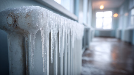 In a cold room, a radiator is frozen with long icicles hanging from it. The light from the windows creates a chilly atmosphere. The wooden floor is visible in the background.