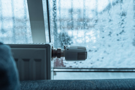 A man's hand in a woolen glove holds a metal radiator on the windowsill.