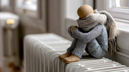 A charming art figurine in a cozy pose sits atop a radiator, wrapped in a knit scarf. This warm indoor scene evokes feelings of comfort and tranquility.