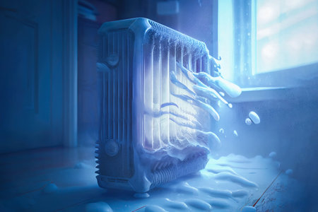 Cold in apartments due to expensive electricity and gas energy crisis problems with heating housing. iced heater concept of a frozen dwelling, blue background.