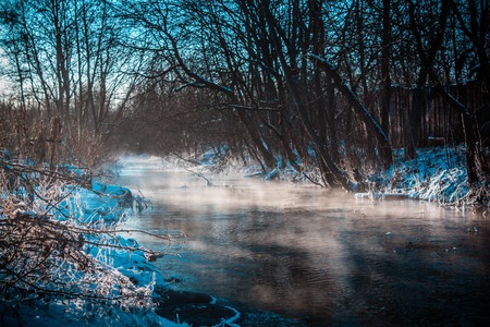 wonderful winter scene. Frosty, misty morning on the small river. frost covered trees in the warm glow of sunrise on the beach. The beauty of the world. Europe. Ukraine. Ternopil