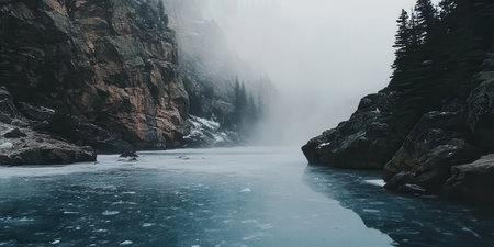 Frozen Lake Dramatic Mountain Landscape Winter Scenery Cold Nature Misty Rocks Ice fog icy snow calm