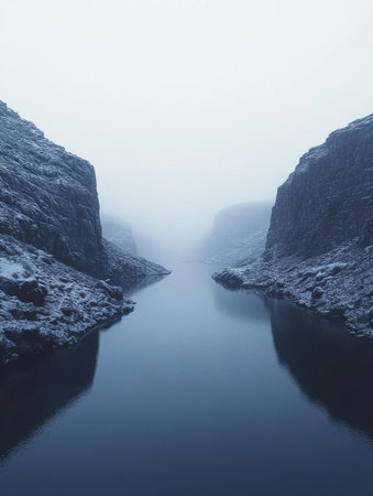 Serene Winter Landscape Snowy Mountains River Nature Scenery Cold Peaceful Tranquil Blue Mist Quiet