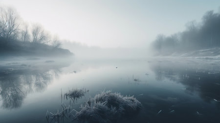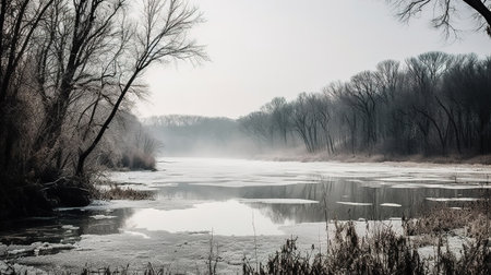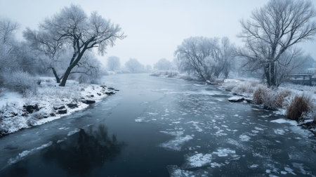 A tranquil winter landscape featuring a frosty river surrounded by bare trees and soft fog. This icy scene evokes feelings of peace and stillness in nature.