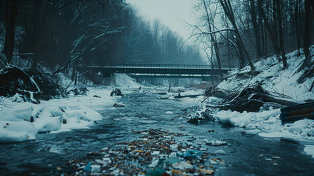 river in a snowy forest has become overwhelmed with garbage, creating a stark contrast to the serene winter landscape. The remnants of a blown-up bridge add to the scenes desolation.