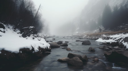 Mountain river in the winter with snow and fog, long exposure. AI Generated.