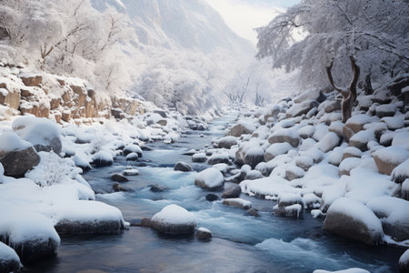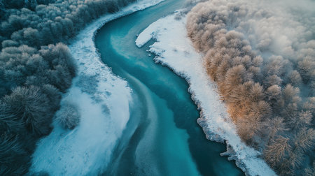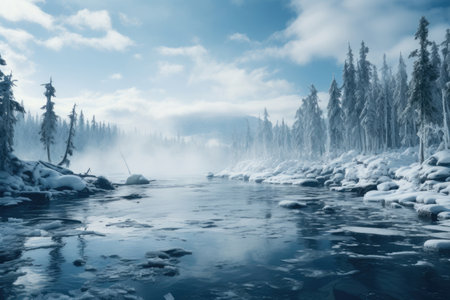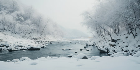 The hushed beauty of winter captured in a landscape adorned with a frozen river, serene and still. Ai Generated