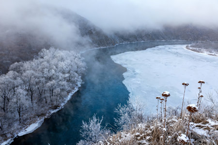 Foggy winter landscape with frozen mountain river and hoarfrost