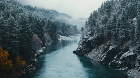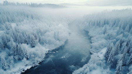 This captivating winter landscape showcases a serene river winding through a snowy forest, surrounded by pine trees and ethereal fog. Perfect for nature lovers.