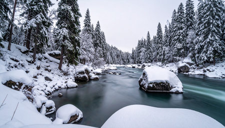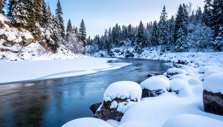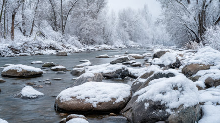 Snow blankets rocks along a winding river surrounded by frosted trees in a serene winter scene.