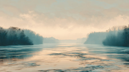 A serene river landscape captured at dawn, enveloped in soft fog and gentle reflections, creating a tranquil scene that invites calmness and connection with nature.