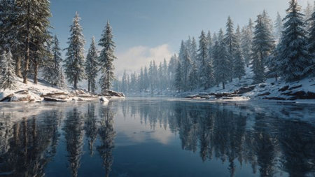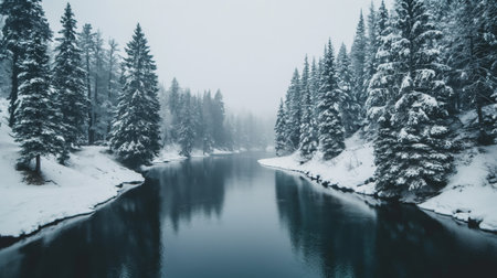 Tranquil and serene snowy riverside landscape with evergreen trees and calm water reflecting the winter wonderland scenery. Perfect for nature photography and travel destinations