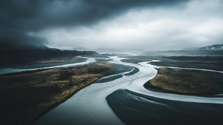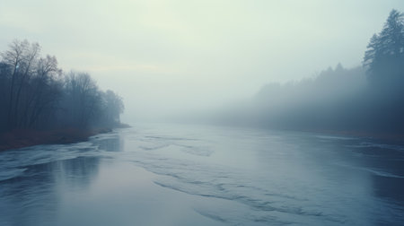 a photo featuring a foggy background in the style of flowing surrealism. the matte finish adds to the romantic riverscape ambiance, with light cyan and gray tones reminiscent of ilya mashkov's work. the soft atmospheric perspective creates a cold and detached atmosphere. ai generated