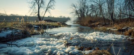 Polluted river with foam and bare trees on a cold winter day