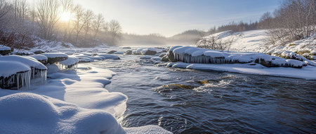 seasonal landscape background winter scene with a frozen river