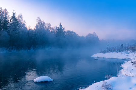Foggy winter morning on the river. Beautiful winter landscape.