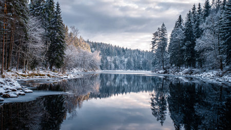 Serene Winter Landscape: Snow-Covered Trees Reflecting on a Cold River