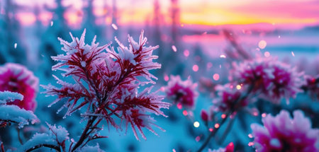 Beautiful winter landscape with pink flowers on the background of the sunset.