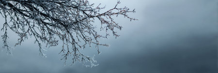 A branch covered in frost and snow. The branch is surrounded by a blue sky. Concept of calmness and serenity