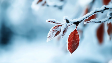 A close-up captures vibrant red leaves delicately rimmed with frost, clinging to a snow-dusted branch against a soft, blurred blue background, evoking the serene beauty of winter.