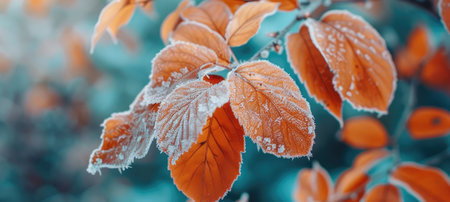 Beautiful colorful nature with bright orange leaves covered with frost in late autumn or early winter