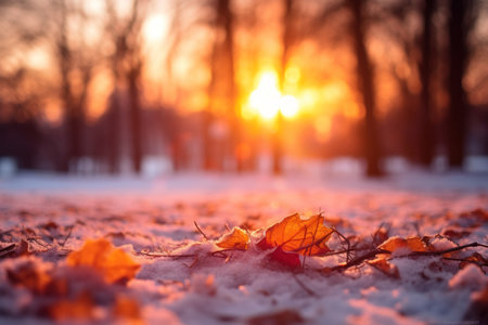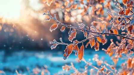 A stunning close-up of frost-covered autumn leaves catches the warm glow of sunset, highlighting the seasonal beauty and tranquility of nature's transition.