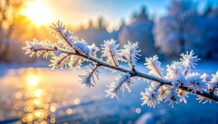 Frozen branch with frost crystals glistening, early morning light generative ai