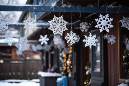 snowflake-themed holiday decorations at a christmas market, created with generative ai