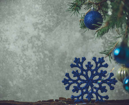 Christmas and New Year holidays background, winter season. Christmas greeting card with ornaments and lights for tree.