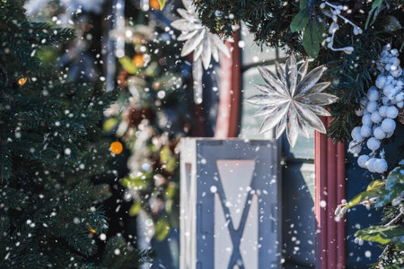 Elegant Christmas decorations featuring silver and gold ornaments, snowflakes, and festive elements create joyful holiday atmosphere. Perfect for seasonal celebrations and winter festivities