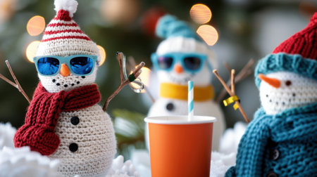 Charming crochet snowmen dressed in colorful scarves and sunglasses are set against a festive background, adding a whimsical touch to winter celebrations.