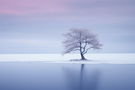 A solitary tree standing on the frozen shore of a lake